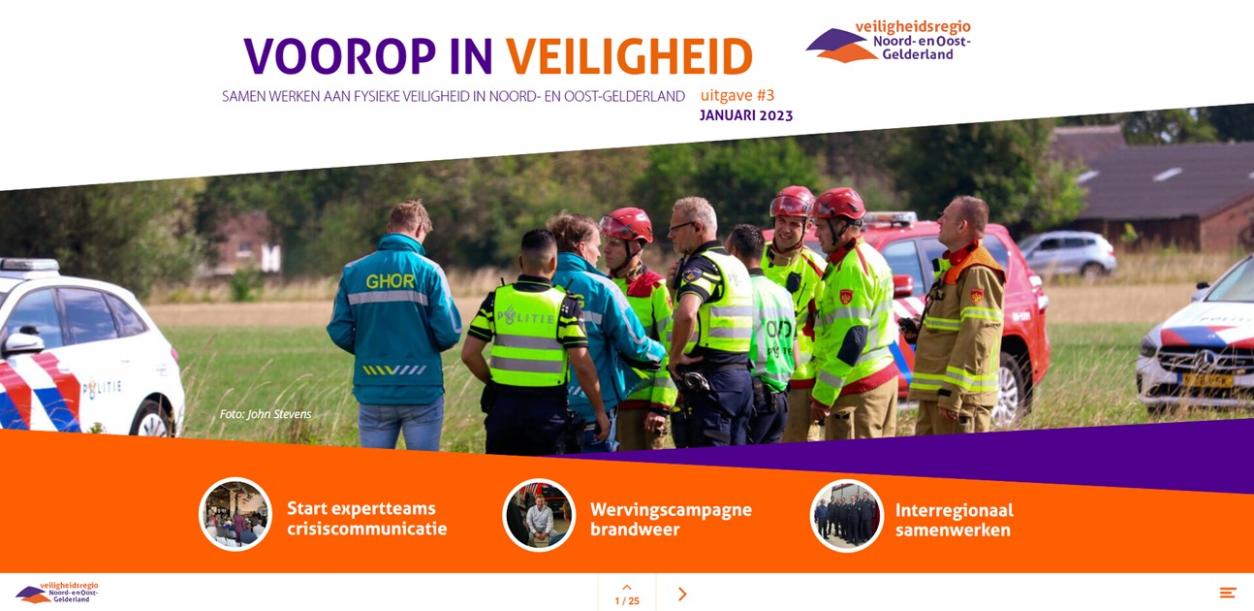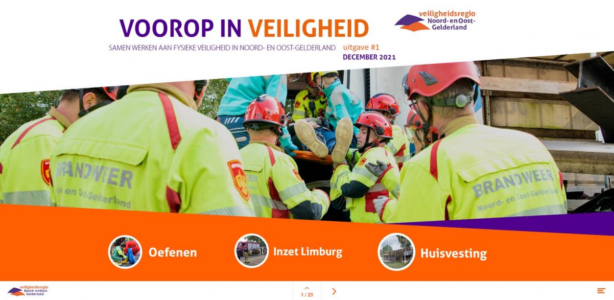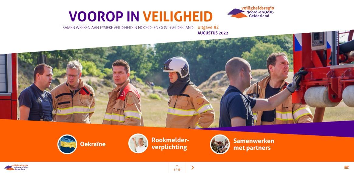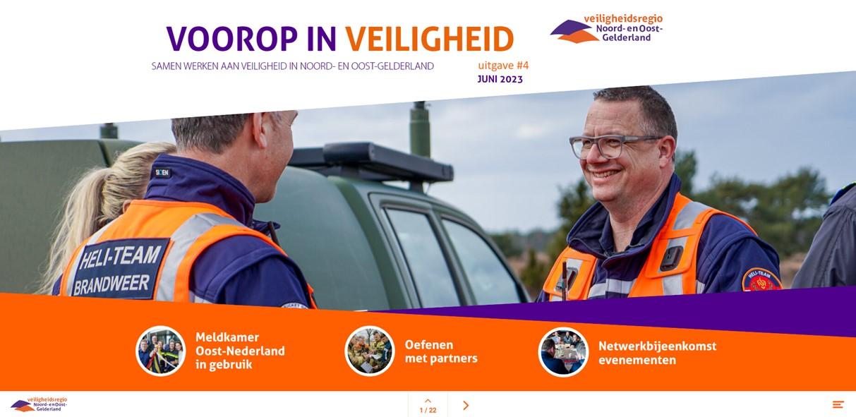 In de vierde uitgave van ons online magazine Voorop in Veiligheid nemen we je met interviews, reportages, foto's en video’s weer mee in ons werk. Onder meer in de oefening met helikopterblussing. We blikken terug op de samenvoeging van de meldkamers van Arnhem, Apeldoorn en Hengelo naar de nieuwe meldkamer in Apeldoorn. Een mega operatie waarnaar lang en minutieus is toegewerkt. Ook krijg je een kijkje achter de schermen over hoe we met campagnes mensen laten nadenken over mogelijke risico’s en welke tips we geven waarmee iemand direct zelf aan de slag kan. Daarnaast hebben we, met de GGD en GHOR, voor evenementenorganisatoren en vergunningverleners een handige infographic gemaakt die kan helpen om de gezondheid en veiligheid op een evenement te vergroten.